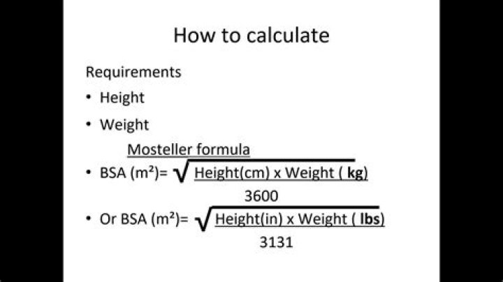 Mosteller Method: BSA (m2) = (height (cm) x weight (kg)/3600)½ eg, BSA (m2) = square root of (height (cm) x weight (kg)/3600)