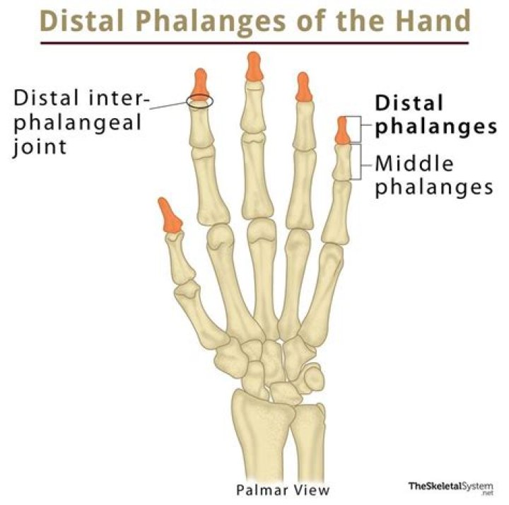 Human hands contain fourteen digital bones, also called phalanges, or phalanx bones: two in the thumb (the thumb has no middle phalanx) and three in each of the four fingers. These are the distal phalanx, carrying the nail, the middle phalanx, and the proximal phalanx.Where is distal phalanges?