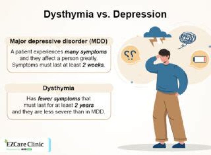 Dysthymia, sometimes referred to as mild, chronic depression, is less severe and has fewer symptoms than major depression. With dysthymia, the depression symptoms can linger for a long period of time, often two years or longer.