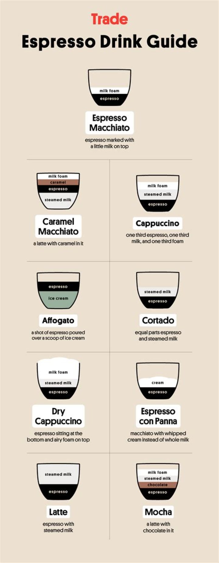 Café Breve: A cappuccino made with half and half instead of milk. It has equal parts of espresso, steamed half and half, and foam. Café Cortado: Espresso with flat steamed milk. Café Latte: One part espresso, two parts steamed milk.