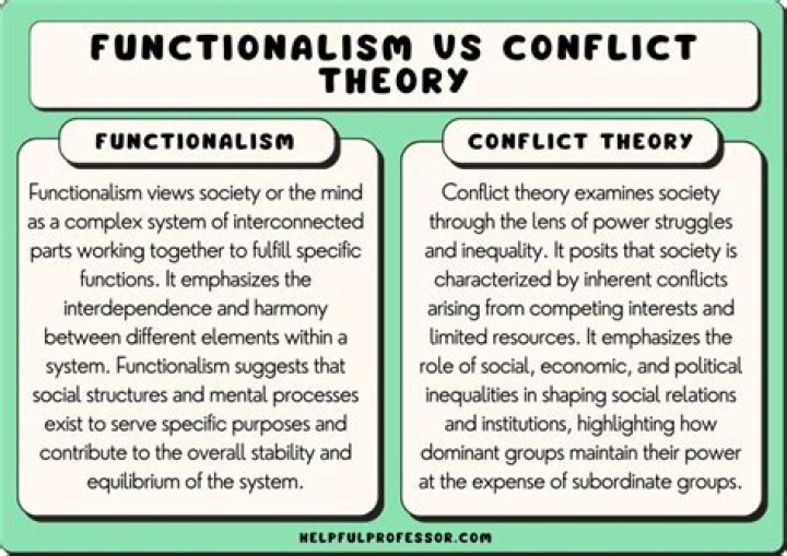 Conflict theory focuses on the competition between groups within society over limited resources. Conflict theory views social and economic institutions as tools of the struggle between groups or classes, used to maintain inequality and the dominance of the ruling class.What is an example of functionalist theory?