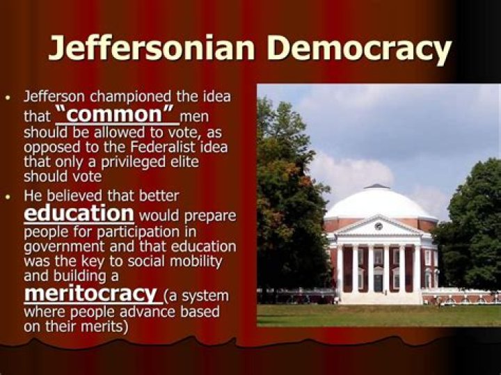 Jeffersonian democracy, named after its advocate Thomas Jefferson, was one of two dominant political outlooks and movements in the United States from the 1790s to the 1820s. … States then also moved on to allowing white male popular votes for presidential elections, canvassing voters in a more modern style.