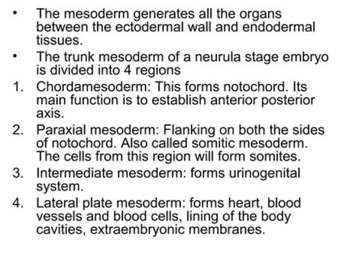 The mesoderm layer lies between the endoderm and the ectoderm. Cells derived from this layer give rise to all other tissues of the body, including the dermis of the skin, the heart, the muscle system, the bones, and the bone marrow.