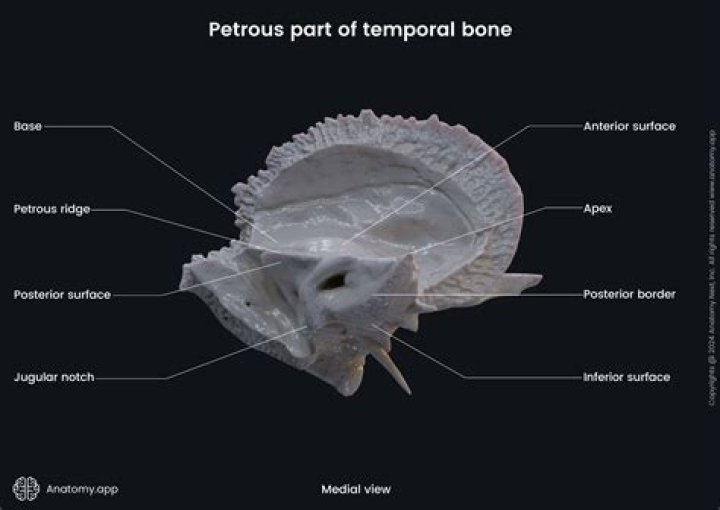 The petrous apex is located in the temporal bone — one of the bones of the skull that houses the structures of the ear. The petrous apex is a difficult area for surgeons to get to; it is essentially just off the midline of the skull base.