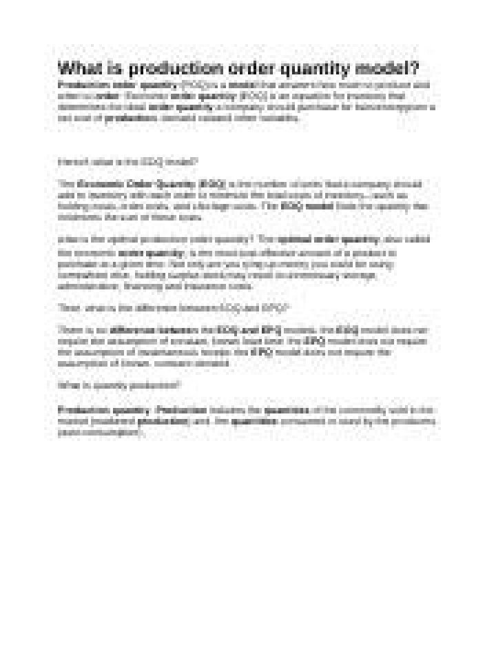 The economic production quantity model (also known as the EPQ model) determines the quantity a company or retailer should order to minimize the total inventory costs by balancing the inventory holding cost and average fixed ordering cost.