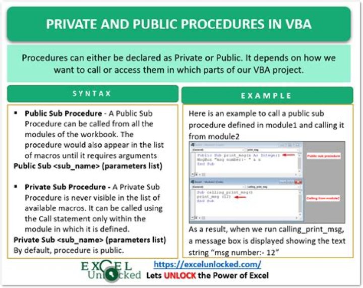 In the case of private VBA Sub procedures, this means that they can only be accessed or called by those procedures that are stored in the same VBA module. Any procedures within any other module are not able to call it, even if those other modules are in the same Excel workbook.