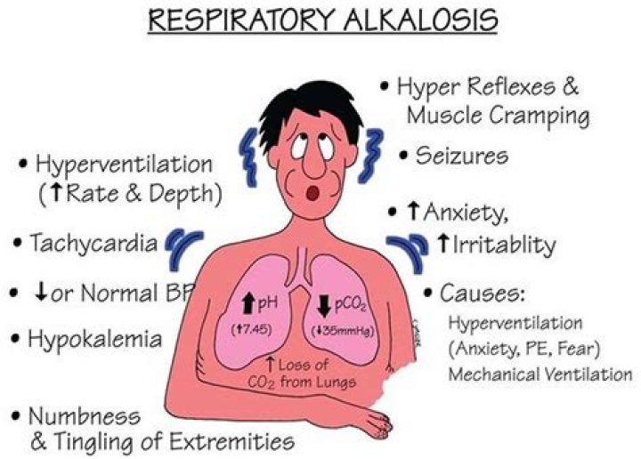 A person may breathe too fast due to anxiety, overdosing on certain medications, or using a ventilator. Symptoms of respiratory alkalosis may include muscle spasms, irritability, dizziness, and nausea. Respiratory alkalosis is one possible classification of an acid-alkaline imbalance in the body.