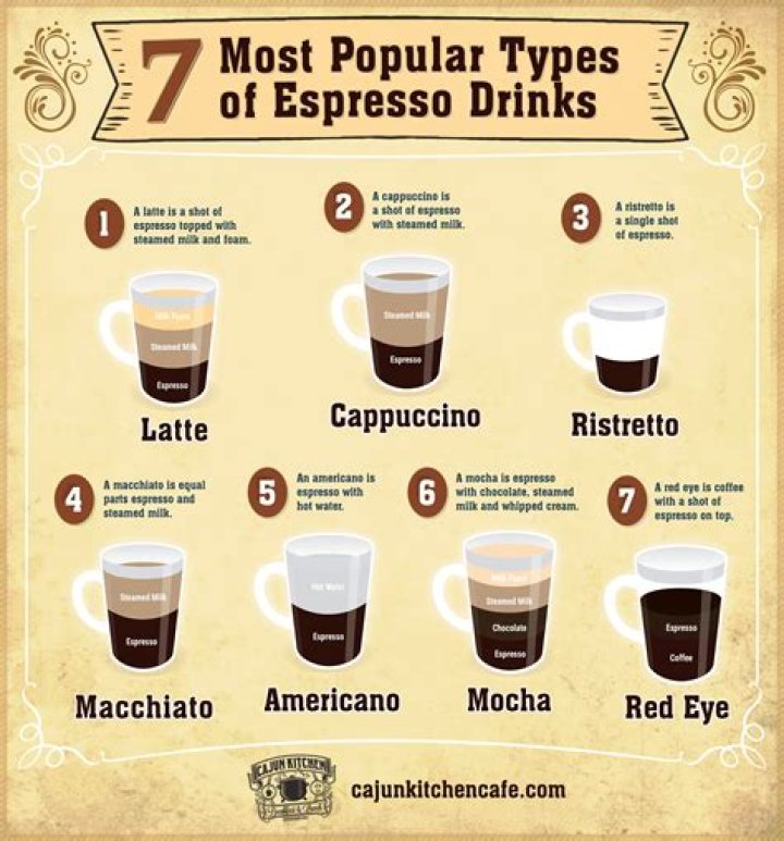 #1 Espresso (double shot) In most coffee shops, a double shot is a default. … #2 Americano. … #3 Latte. … #4 Cappuccino. … #5 Flat White. … #6 Macchiato. … #7 Cortado. … #8 Ristretto.