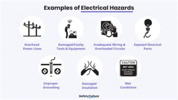Examples of electrical hazard risks include: Electric shock and burns from live wire contact. Fires from faulty wiring. Overloading circuits. Leaving electrical parts exposed.