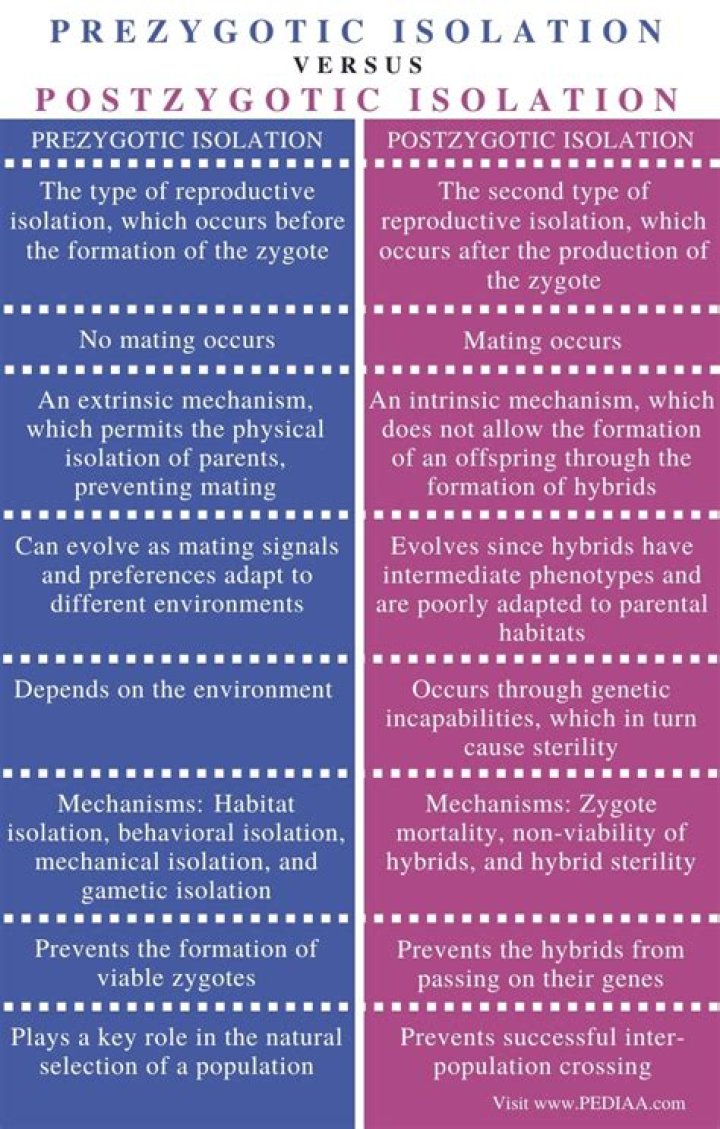 Prezygotic isolation prevents the fertilization of eggs while postzygotic isolation prevents the formation of fertile offspring. Prezygotic mechanisms include habitat isolation, mating seasons, “mechanical” isolation, gamete isolation and behavioral isolation.What are the 5 Prezygotic barriers?
