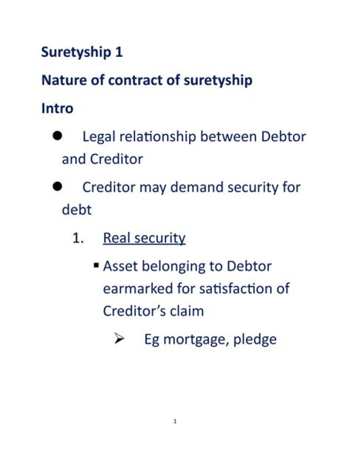 A surety is this form of personal security, and it occurs when a creditor requires a third party to contractually bind him/ herself for the fulfilment of the obligation. The debtor may also bind his assets as security for the debt, which is known as real security.