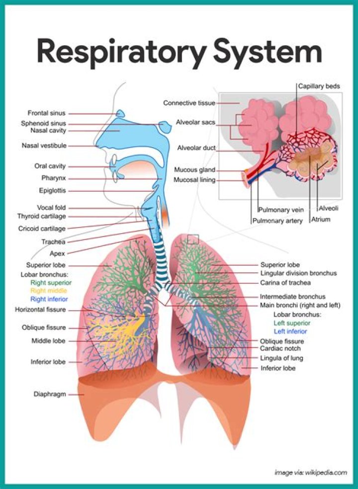 The Respiratory System is everything we use to breathe and supply our bodies with oxygen. We breath air into our lungs. Oxygen is then transported around our body by our blood. The bronchioles end up at small bags called the alveoli, where gaseous exchange takes place.