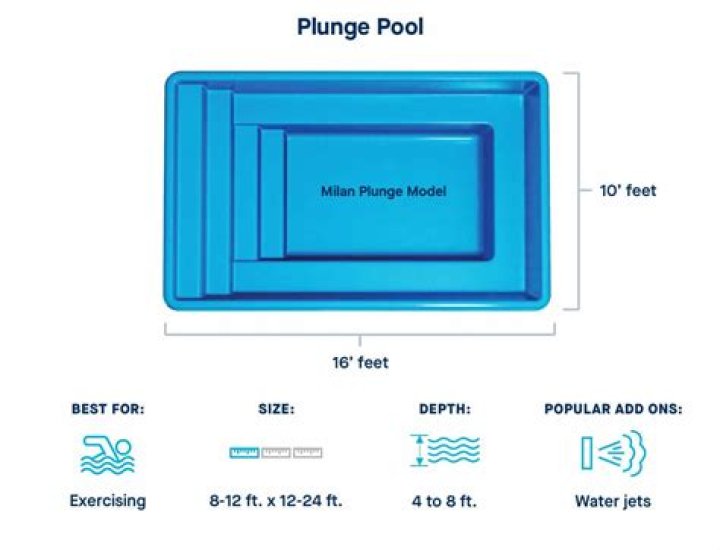 Because they can be built on-site like traditional pools, the size can vary widely. But plunge pools typically run from 6 1/2 to 10 feet wide and 10 to 22 feet long. The depth ranges from 5 1/2 to 7 feet, and the bottom is almost always flat. A plunge pool that’s 10×20 feet is a popular size.