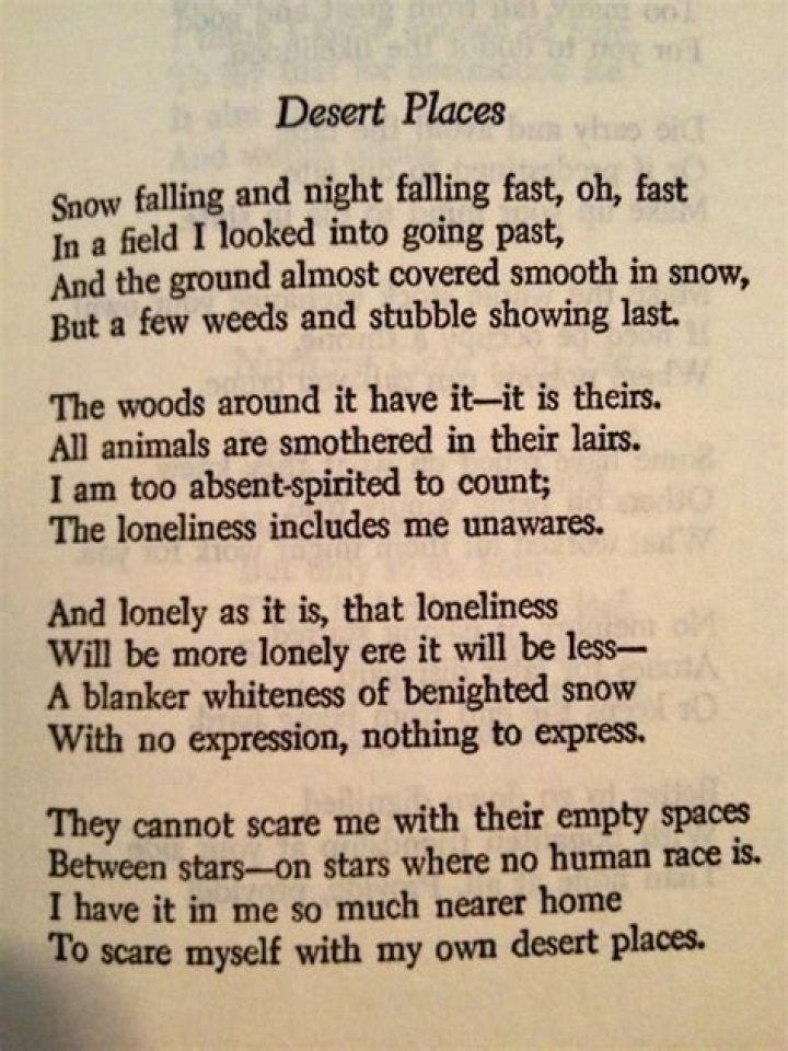 ‘Desert Places’ by Robert Frost is a dark poem that uses a snowstorm to depict universal human loneliness and the inevitable return of depression. ‘Desert Places’ is a four stanza poem that is separated into sets of four lines, known as quatrains.