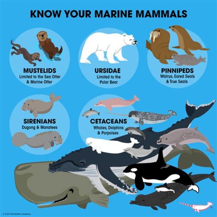 Marine mammals are classified into four different taxonomic groups: cetaceans (whales, dolphins, and porpoises), pinnipeds (seals, sea lions, and walruses), sirenians (manatees and dugongs), and marine fissipeds (polar bears and sea otters).