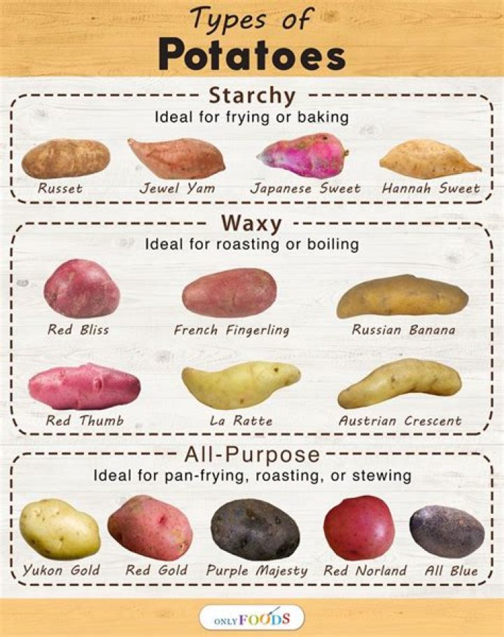 Remember that potatoes fall into three basic categories: starchy, waxy, and those in-between which are referred to as all-purpose. Starchy potatoes are great for baking and frying.