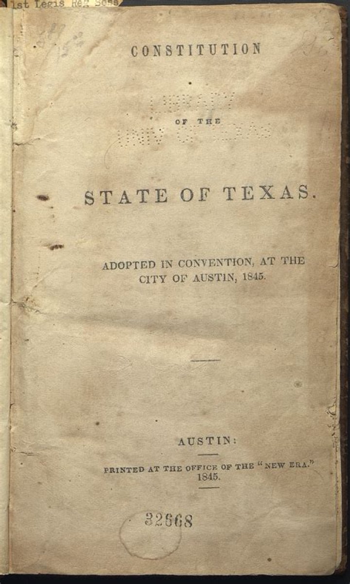 The first Texas state constitution, framed in 1845 as a condition of admission to the United States, was based on constitutional principles common in the United States, among them the concept of a written constitution itself, whose source of authority was the people (popular sovereignty), guarantees of individual …