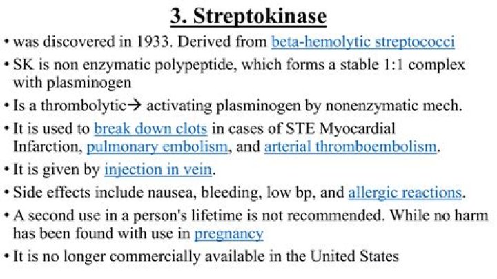 Streptokinase is in the antithrombotic family of medications and works by turning on the fibrinolytic system. Streptokinase was discovered in 1933 from beta-hemolytic streptococci.