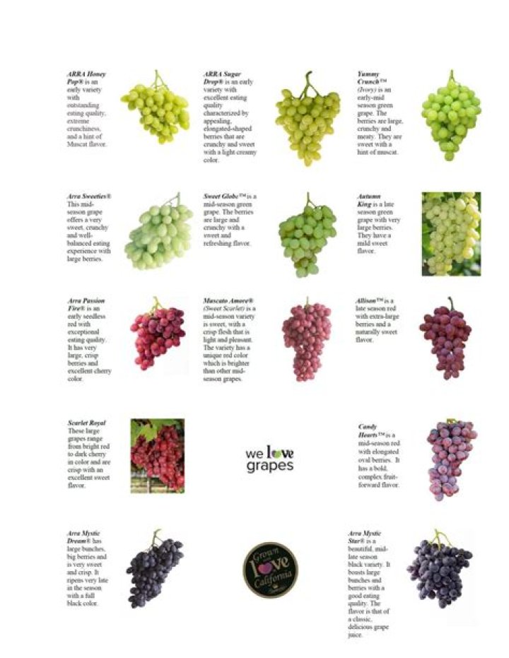 Table grapes commonly sold in North American and European markets include Sultana (Thompson Seedless), Flame, Muscat, Almeria, Niagara and Concord.