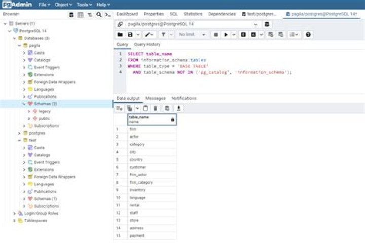 - Using SQL Query. We can list all PostgreSQL schemas using the (ANSI) standard INFORMATION_SCHEMA: SELECT schema_name FROM information_schema.schemata; …