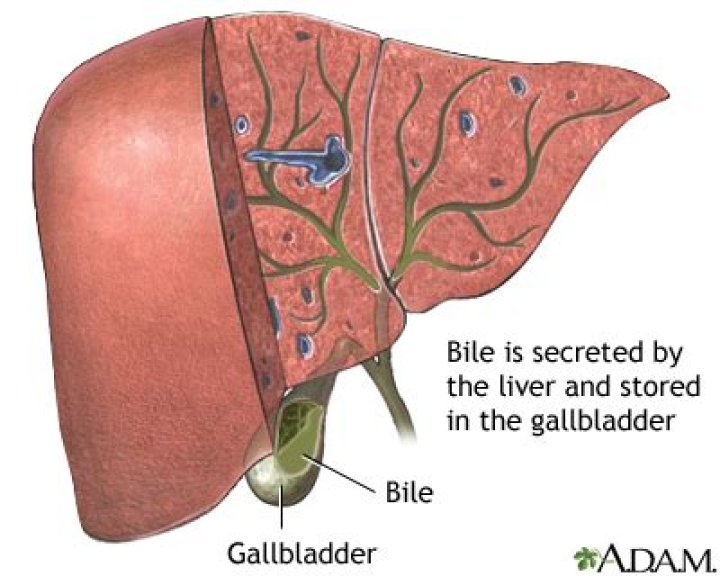 About 50% of the bile produced by the liver is first stored in the gallbladder. This is a pear-shaped organ located directly below the liver. Then, when food is eaten, the gallbladder contracts and releases stored bile into the duodenum to help break down the fats.Why is too much bile produced?