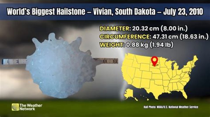 The largest hailstone ever measured in the U.S. was 8 inches in diameter in Vivian, South Dakota, on July 23, 2010. The Vivian hailstone was also the nation’s heaviest (1.94 pounds). The world’s heaviest hailstone was a 2.25-pound stone in Bangladesh in April 1986.