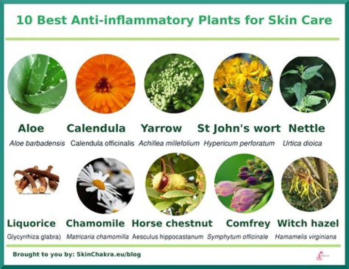 Camomile. What it does: High in the compound alpha-bisabolol, chamomile helps reduce inflammation, which soothes acne, rashes and eczema. … Sage. … Mint. … Aloe vera. … Lavender. … Calendula. … Thyme. … Rosemary.