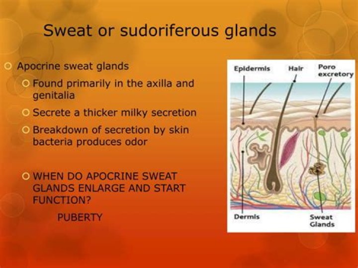 Most apocrine glands in the skin are in the armpits, the groin, and the area around the nipples of the breast. Apocrine glands in the skin are scent glands, and their secretions usually have an odor. Another type of gland (eccrine gland or simple sweat gland) produces most sweat.What are apocrine and eccrine Sudoriferous glands?