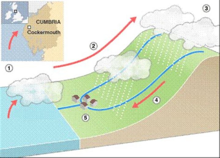 The warm air from the mid-Atlantic caused relief rainfall over the Cumbrian Mountains. The warmer the air, the more moisture it holds. … The falling rain poured into the River Derwent and River Cocker. Cockermouth is located at the rivers’ confluence and as a result, suffered significant flooding.