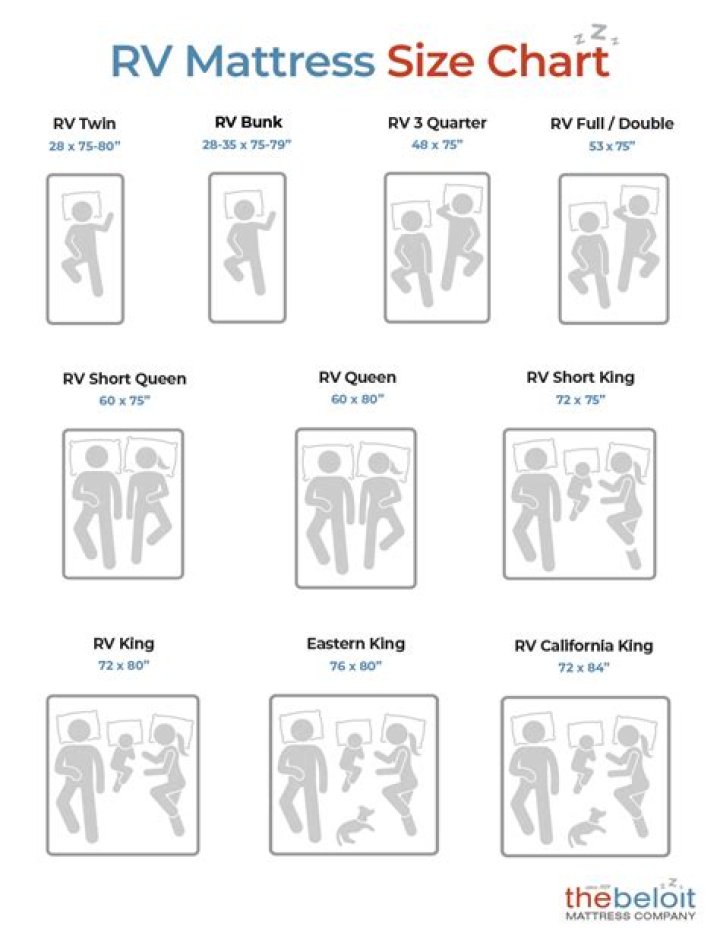 Many RV mattresses are different than standard residential sizes. … Other sizes of mattresses are sometimes the same as their residential counterparts. Twin and full (aka double) beds are often the same in RVs as they are in homes. King-size beds in RVs are usually narrower than residential mattresses.What size is a king size mattress?